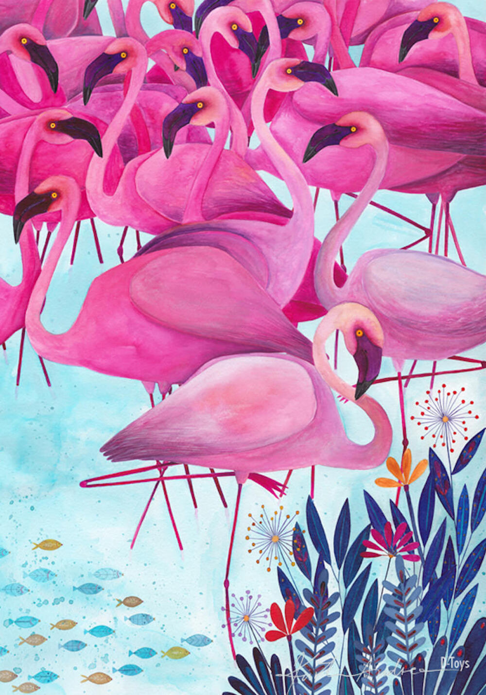 Sárga gyöngyszemű flamingók ácsorognak türelmesen a tóban. De mintha egyikük felkapta volna a fejét egy hangra... Merre hívja őket a szél? Kürti Andrea erdélyi illusztrátor gyönyörű, 1000 darabos kirakójának elkészítése közben talán megkapjuk a választ.