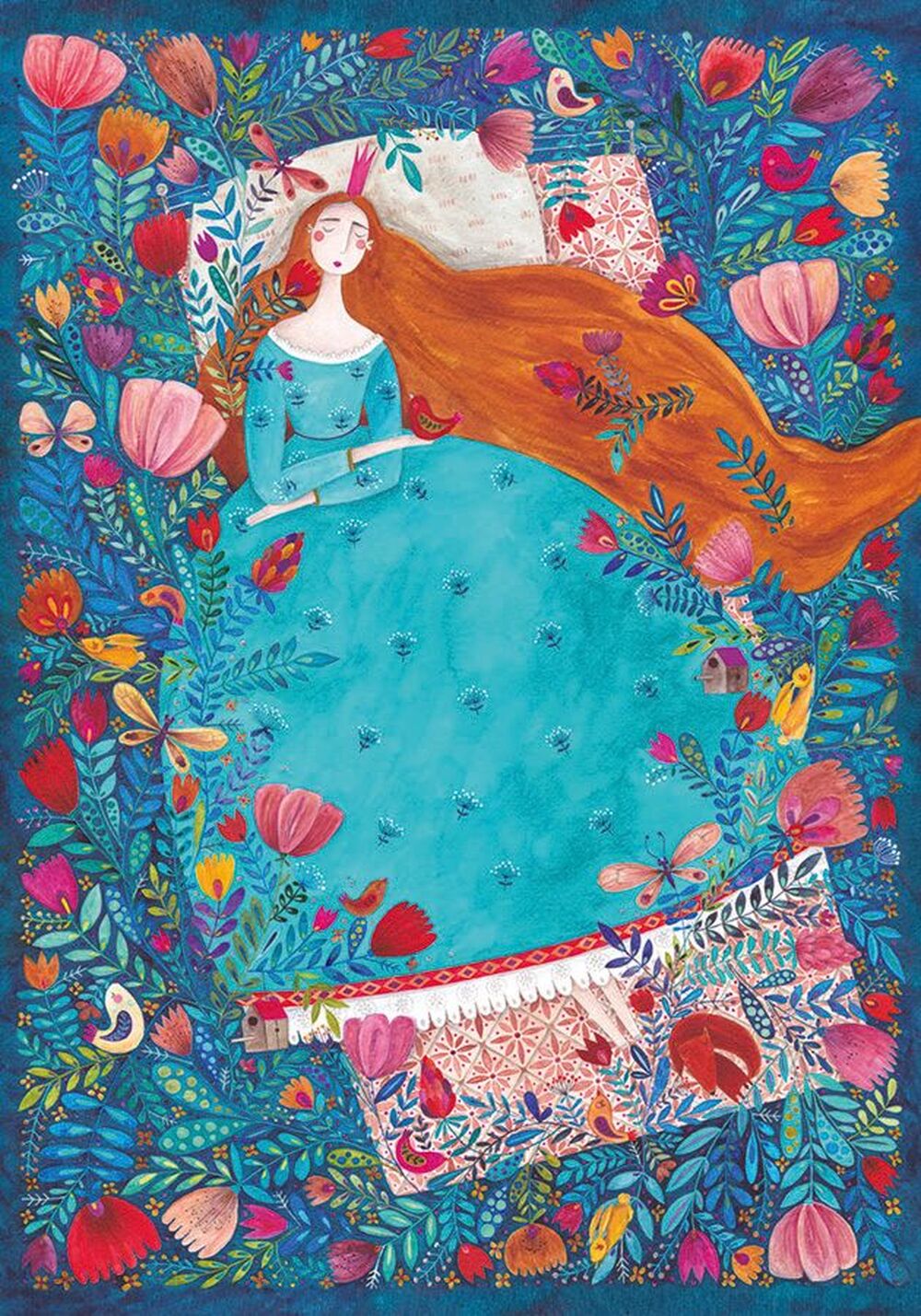 A szinte hímzésekhez hasonló rajzolatú képen, madaras-pillangós kertjében szépséges álomba merült Csipkerózsika várja ébredését. Mire Kürti Andrea erdélyi illusztrátor gyönyörű, 1000 darabos kirakóját kirakosgatjuk, addigra talán a királyfi is átvágja magát a csipkebokrokon...
