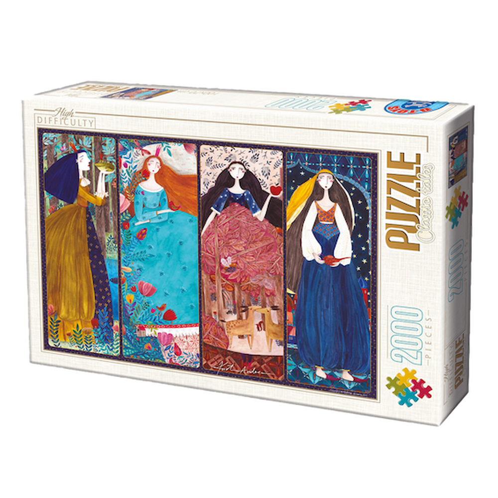 Kürti Andrea erdélyi illusztrátor gyönyörű képén Csipkerózsika, Hófehérke, Seherezadé és a Békakirálykisasszony egyszerre szerepel. Tapasztalt egyéni kirakósoknak (14+) vagy családi, közös alkotáshoz ajánljuk!